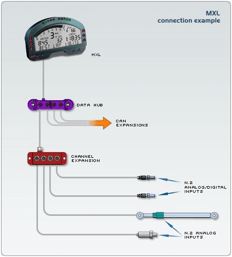 Channel Expansion è il nuovo moltiplicatore di canali che permette di migliorare le prestazioni del datalogger (MXL Pista/Pro, EVO3 Pista/Pro, EVO4) via CAN bus, fornendo quattro canali addizionali.