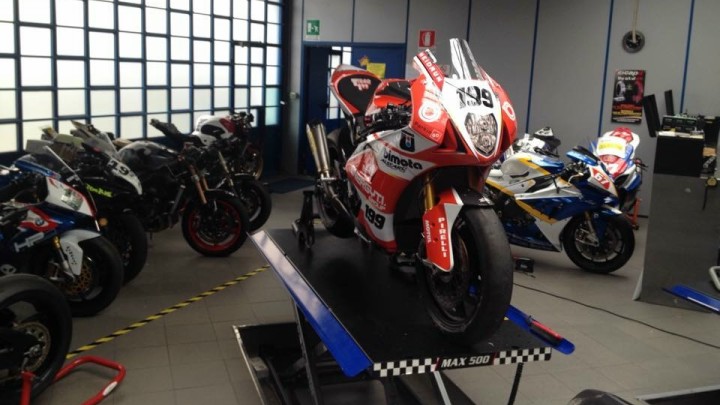 Un'officina attrezzata per la manutenzione e i tagliandi delle moto stradali ed una seconda adiacente dedicata alla preparazione e al test delle moto da pista.